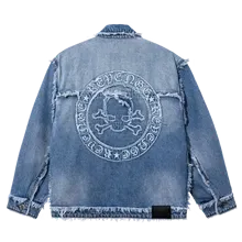 FRAYED SKULL PATCH DENIM JACKET INDIGO